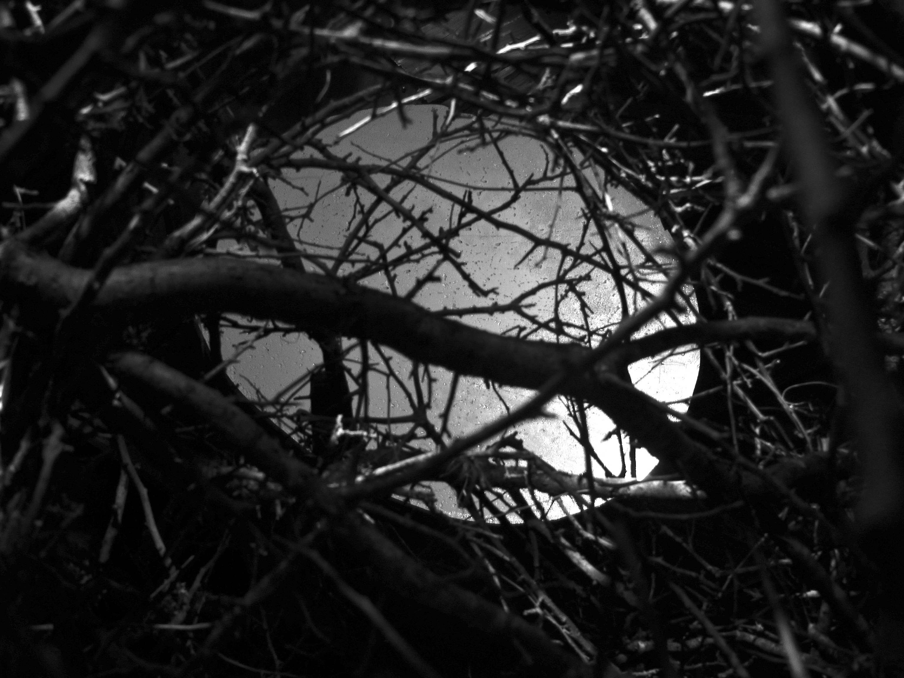 Moonlight through the tangled thorny forest of the blackthorn egg, cast ghostly reminders of wildwood onto the planed and tamed timbers of the Exbury Egg in the early hours this morning.