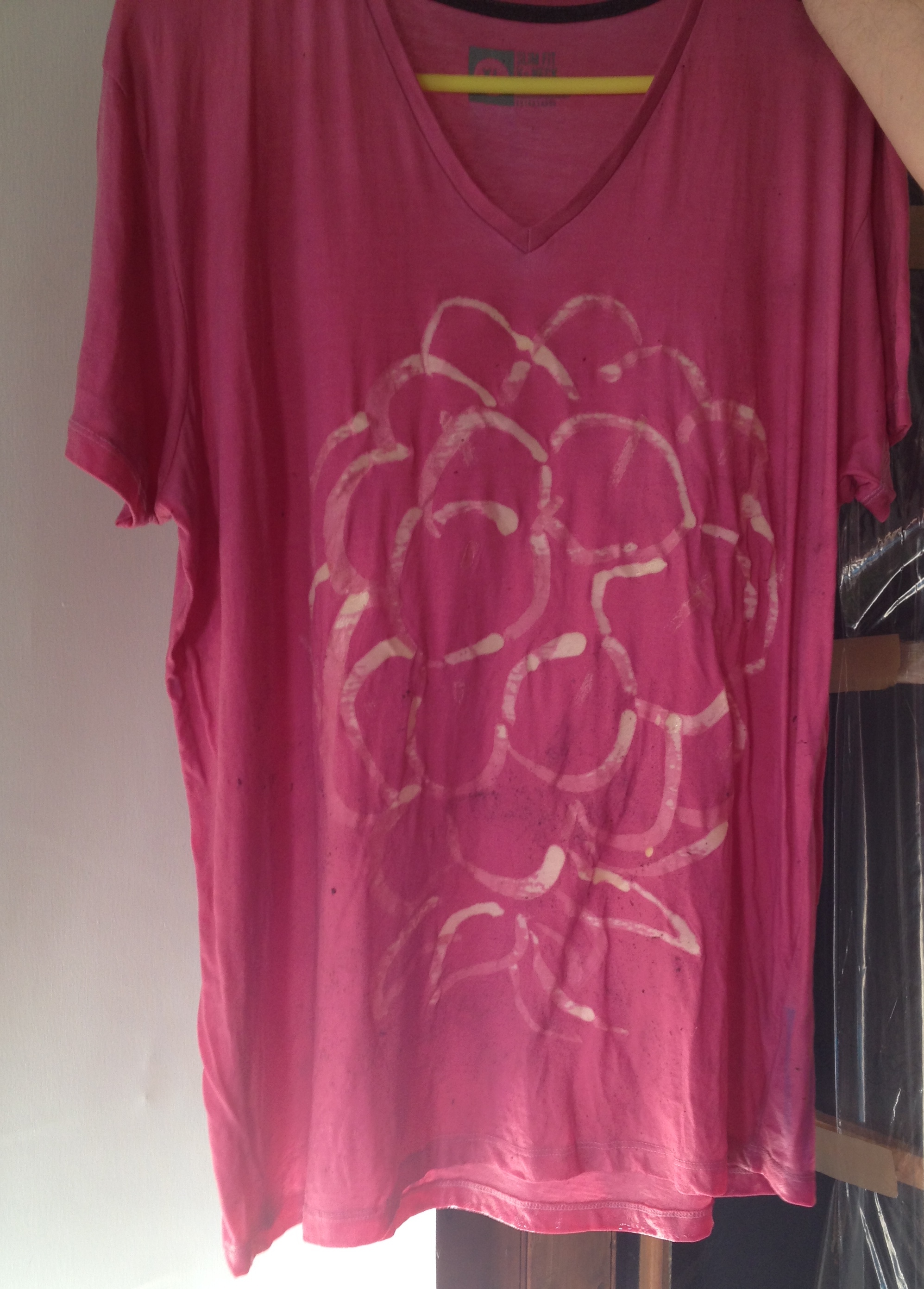 Blackberries stored since last September were boiled to extract juices which, with the addition of alum and cream of tartar, infused cotton with their essential vibrant energy. The resulting T shirt is part of an evolving collection of ceremonial and practical Beadle wear. A test on paper produced a much flatter and cooler purple colour.