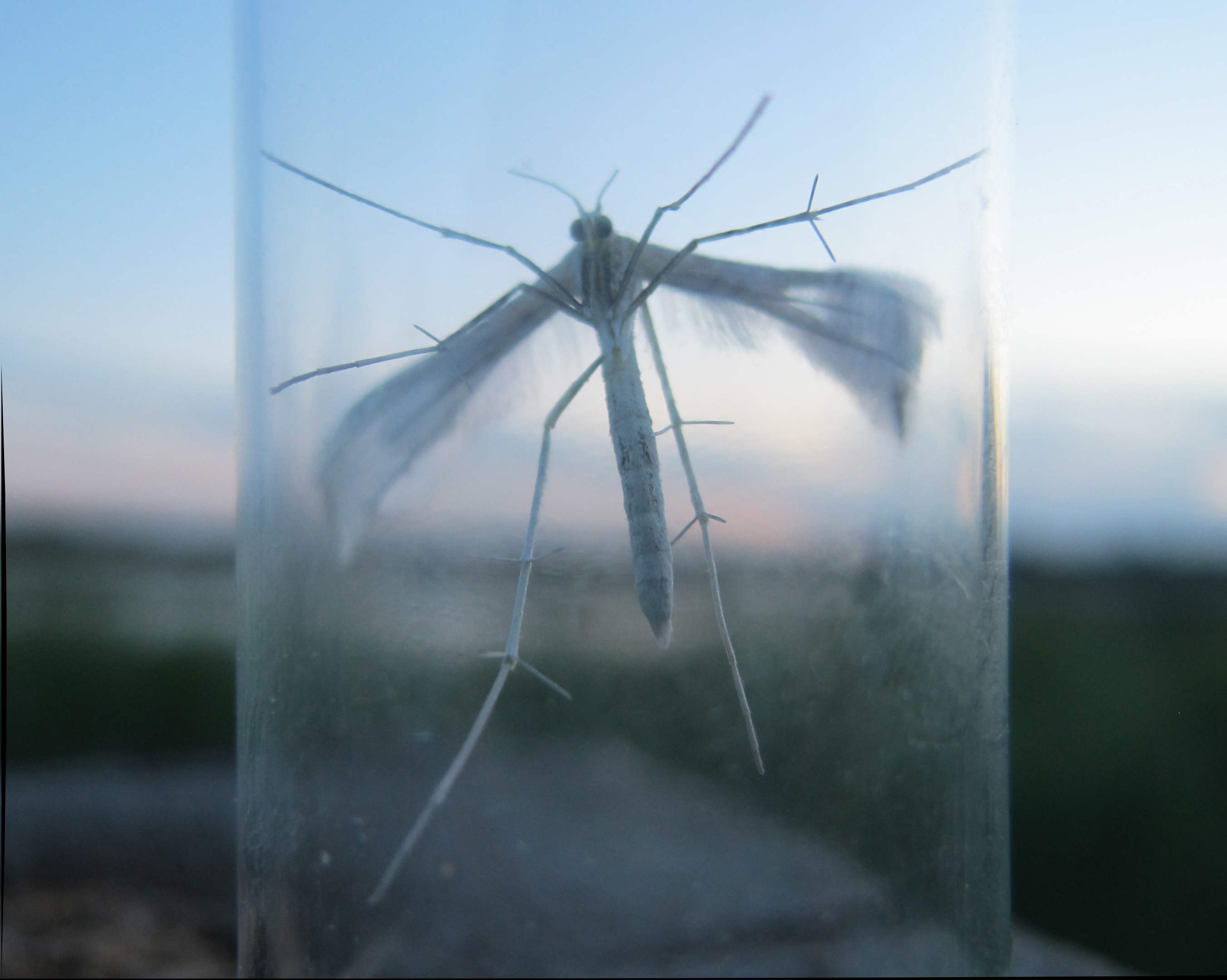 The budding brambles on Blackberry Way are increasingly interwoven with the counterpoint of twisting con volvulus. Amongst this bind weed abides the white plume moth, which I observed for a few moments before releasing it into the warm evening air.