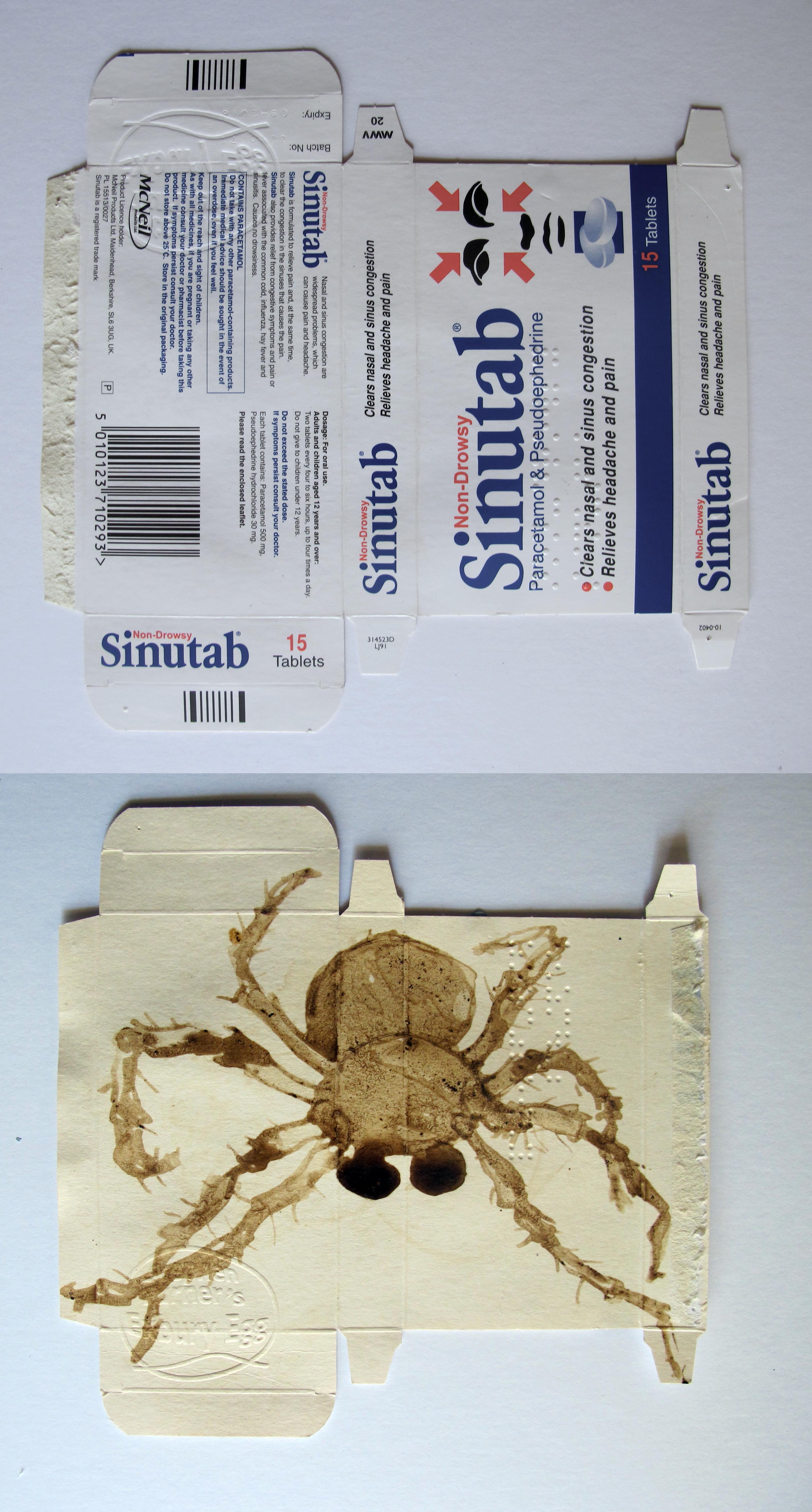 One of a collection of drawings on the verso of 31 empty packages of goods consumed in April; Bi-Narrative No14_Sinutab Spider. The boxes continue one narrative about headaches, breakfasts (cereal boxes), power consumption (battery boxes) etc. The verso drawings in Exbury oak ink reflect other daily obsessions, rituals and interests. This is one of the orb web spiders living in the egg and the subject of an earlier blog (a video making the drawing itself). I endeavour not to waste material in the Egg.